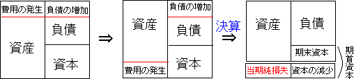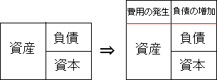 商品を仕入れて(費用が発生して)負債が増加した(約束手形を振出した)場合には、資産には変化がありません(現金も当座預金も変化していない)。資産が同じで負債が増加したからその分資本が減少することになります。、ただし、資本の減少は決算時にならないとわかりにくいです(図1.3)。