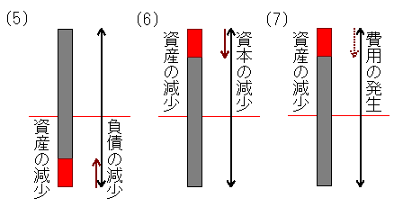 借入金という負債が減少したので、負債の減少ベクトル(赤色の上方向の矢印↑)を書きます。また、負債の減少が原因で現金という資産が減少したので、資産棒を減少分だけ下側で縮めます(赤色の四角)。