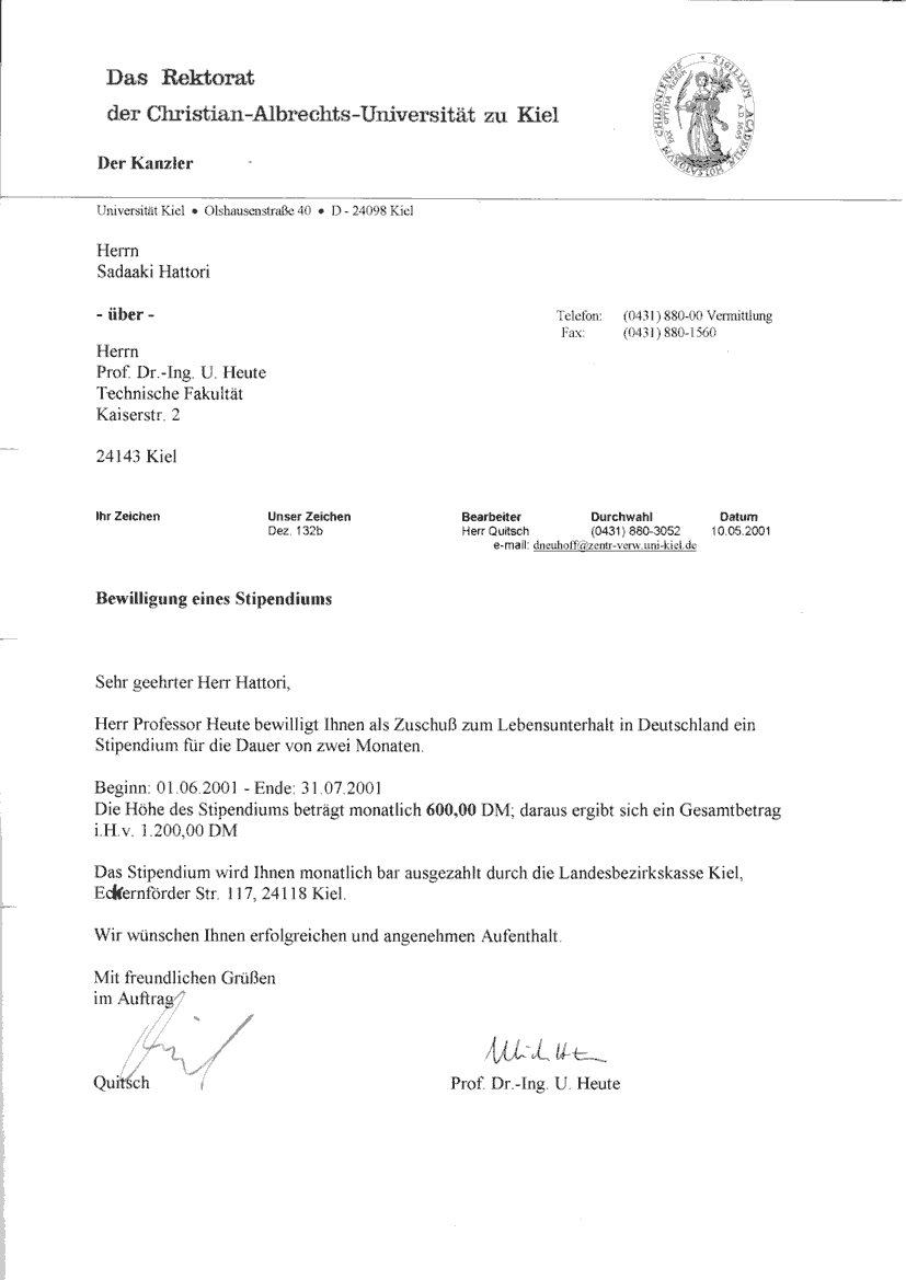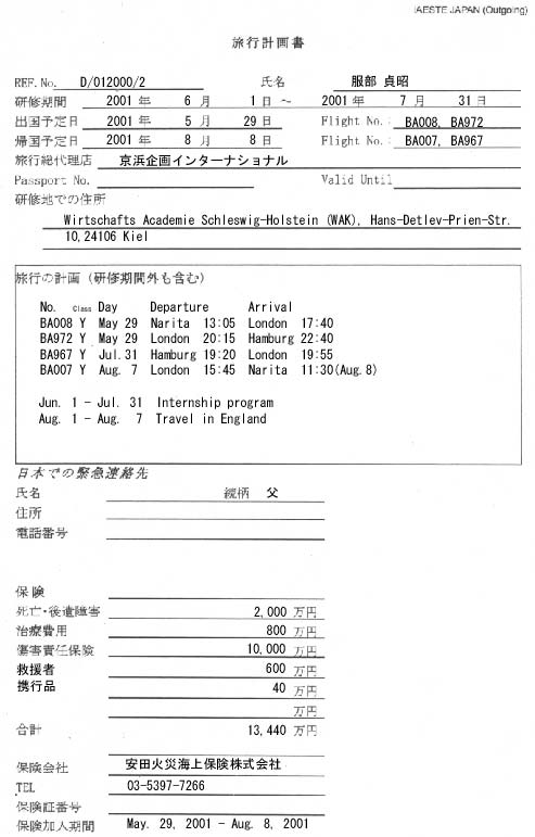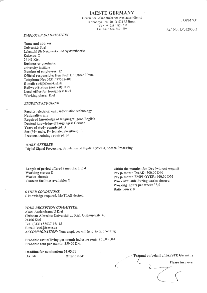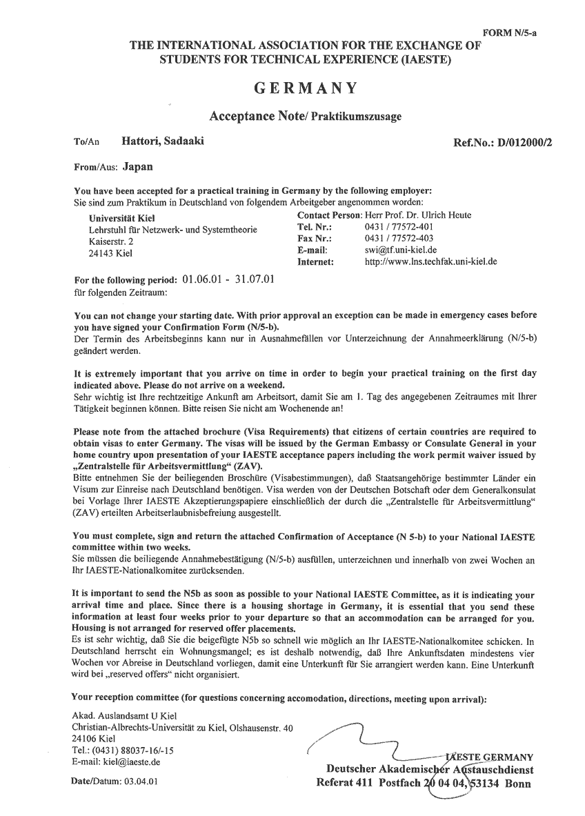 2001年6月1日〜7月31日の間、私はドイツのキール(kiel)という街でインターンシップに参加しました。インターシップというのは欧米で非常に盛んで、学生が就職前に企業や大学である期間働いて、仕事の経験を積んだり自分の適性を見分けたりするものです。最近は日本でも主に大会社で行われるようになっていますが、日本の場合は長期休暇中の2週間あるいは1ヶ月とまだ期間は短いです。それに比較して欧米では2ヶ月くらいから長ければ1年と長期間で行われるものが多いです。