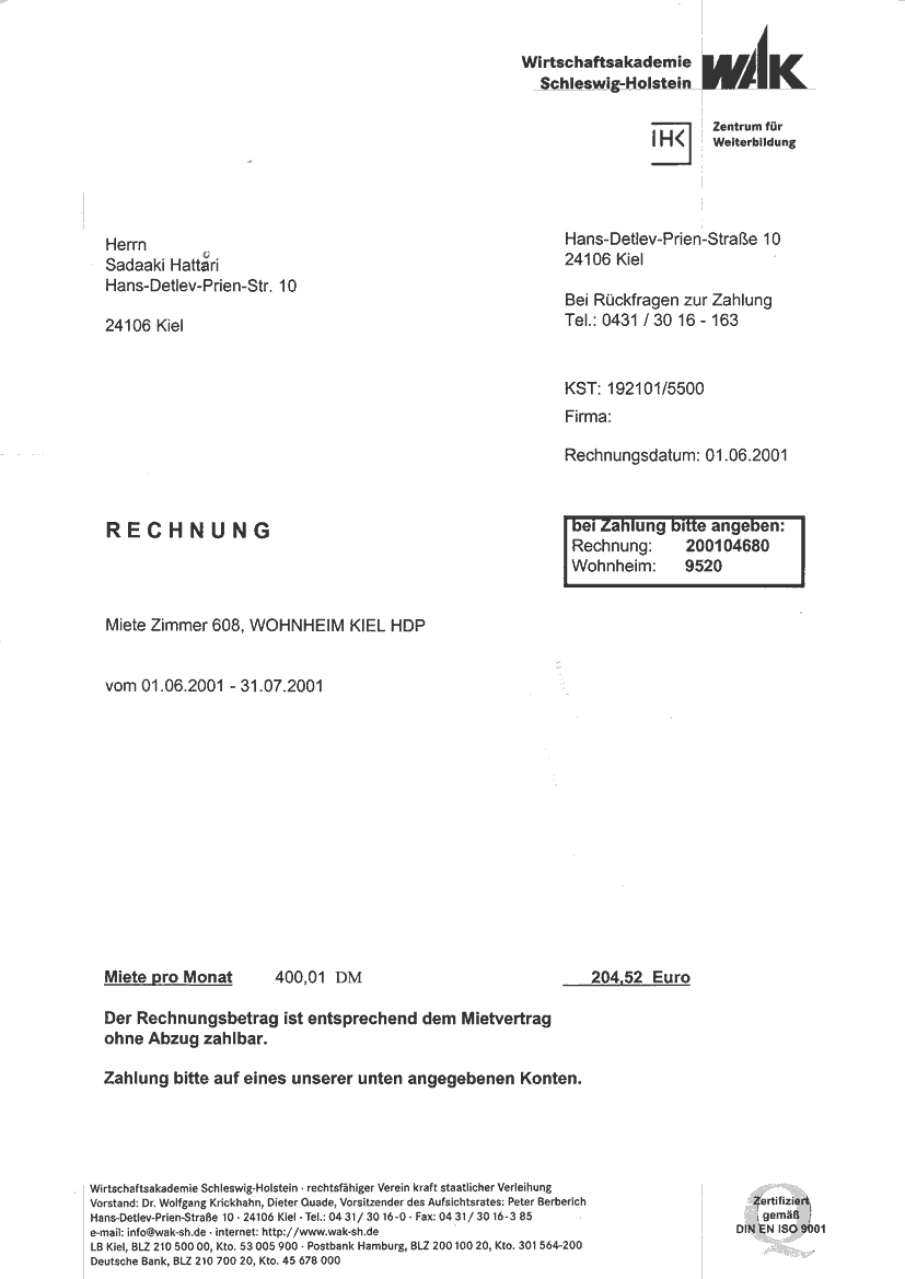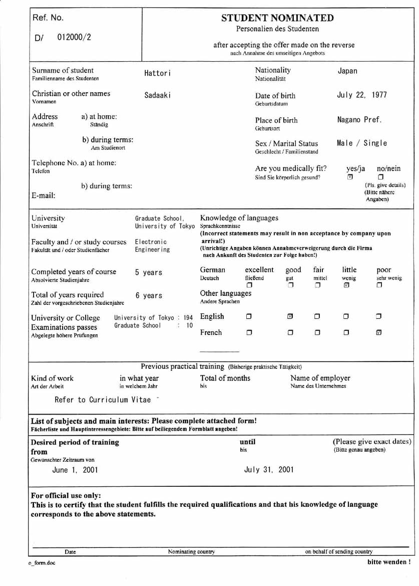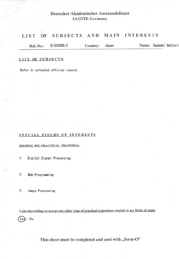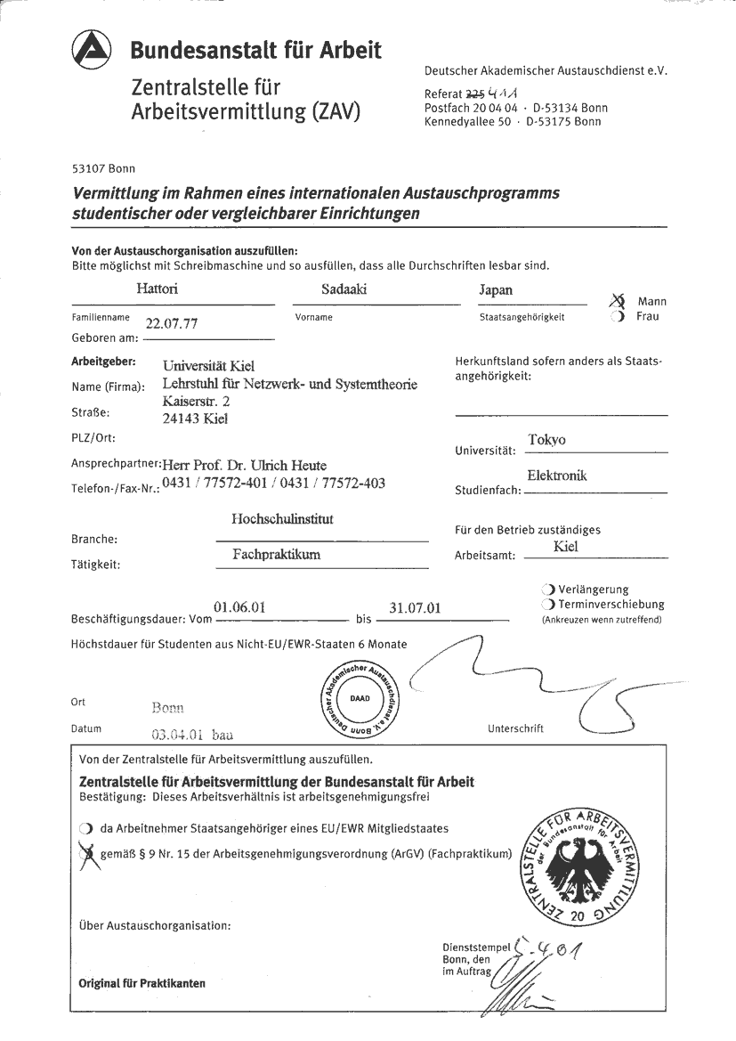 2001年6月1日〜7月31日の間、私はドイツのキール(kiel)という街でインターンシップに参加しました。インターシップというのは欧米で非常に盛んで、学生が就職前に企業や大学である期間働いて、仕事の経験を積んだり自分の適性を見分けたりするものです。最近は日本でも主に大会社で行われるようになっていますが、日本の場合は長期休暇中の2週間あるいは1ヶ月とまだ期間は短いです。それに比較して欧米では2ヶ月くらいから長ければ1年と長期間で行われるものが多いです。