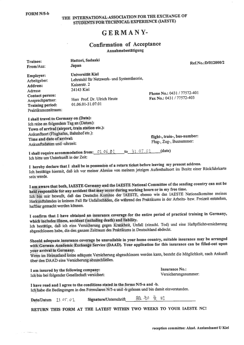 4月下旬: 日本委員会より受け入れ通知書類のFAX版を受け取る