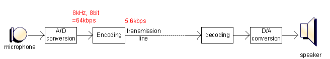 (Encoding)。例えば5.6kbpsにして信号を伝送線(携帯電話では無線)に送りだす。受信側では符号化された信号を再び元の信号に戻し